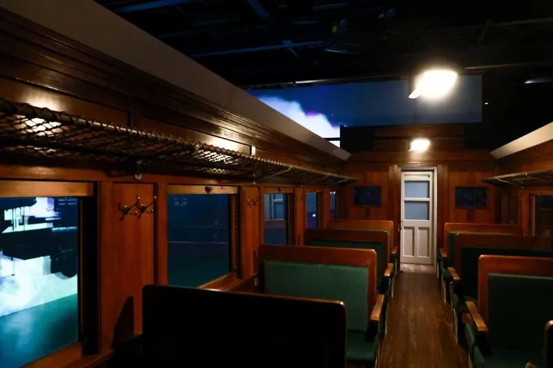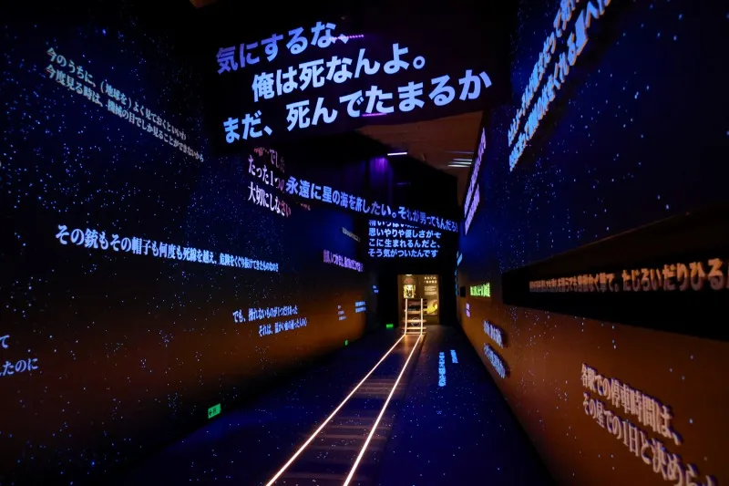 ホワイエには銀河鉄道をイメージした客車が置かれ、客席に腰掛けると車窓には映像の銀河が広がり、地球へ向かう999号が走り抜ける。会場は大きく3つに分かれており、第1会場はイマーシブシアター、第2会場は「言葉の回廊」、第3会場は「物語の裏側へ」となっている。