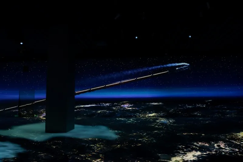 広大な空間で音と光に包まれて、作品の世界に入り込み、鉄郎とともに「銀河の旅人」の一人となる。本展では、1979年に公開された劇場版『銀河鉄道999』へのリスペクトが込められていて、「映画の外側に広がっていたかもしれない空間」まで拡張し、物語世界の中に"存在する"という体験ができる。