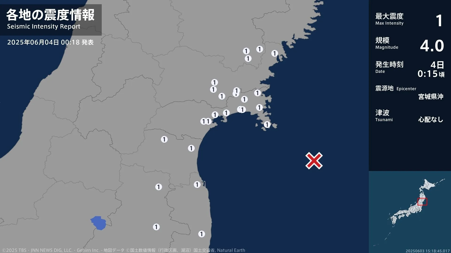 10日午後11時1分ごろ、北海道、青森県で最大震度1を観測する地震がありました。気象庁によりますと、震源地は青森県東方沖で、震源の深さはおよそ50km、地震の規模を示すマグニチュードは4.3と推定されま…